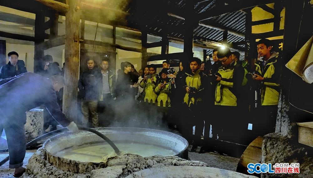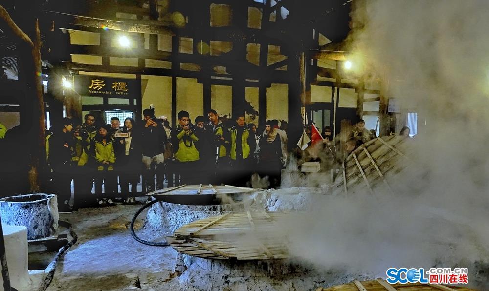 “千年鹽都”得源于自貢悠久的井鹽生產(chǎn)歷史,早在2000年以前,這里就以打井的方式抽取地下鹵水,通過(guò)汲鹵、輸鹵到用鐵鍋進(jìn)行煎鹽,從而制作成成品鹽。燊海井坐落于自貢大安區(qū)阮家壩山下,開(kāi)鑿于清代道光十五年(公元1835年),是當(dāng)時(shí)世界上第一口超千米(1001.42米)深鹽井,至今仍保留著用大鐵鍋土法熬制井鹽的千年傳統(tǒng)手工制鹽技藝。據(jù)介紹,燊海井現(xiàn)有八口圓鍋煎鹽,每日產(chǎn)量仍保持在兩噸左右。