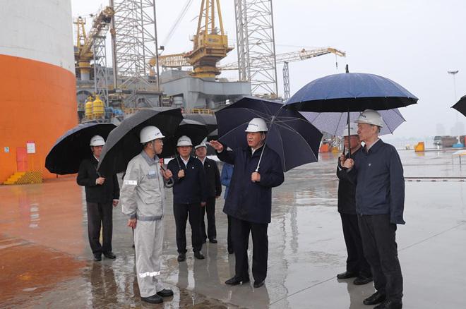 2018年6月13日,習(xí)近平冒雨來到中集來福士海洋工程有限公司煙臺(tái)基地,視察海洋工程設(shè)備建設(shè)場(chǎng)地。新華社記者 謝環(huán)馳 攝