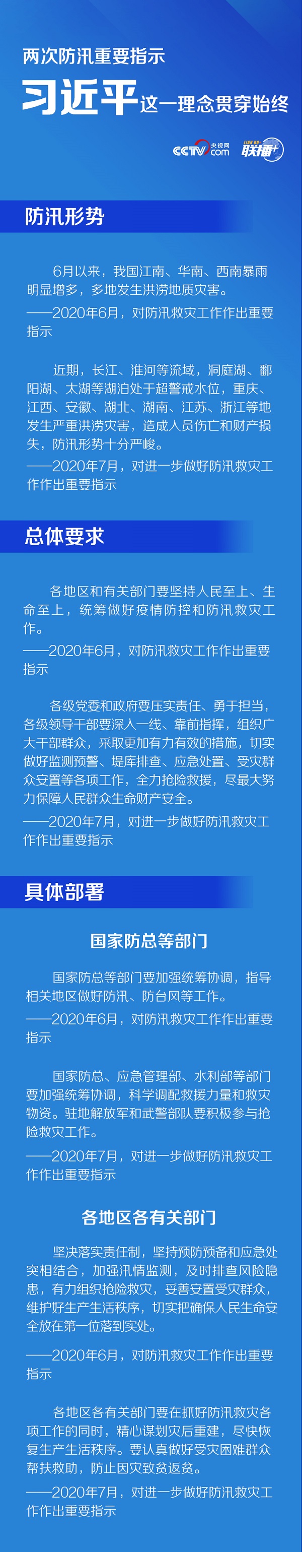 這是習近平總書記近期第二次對防汛救災工作作出重要指示。在6月作出的重要指示中,總書記要求,“各地區和有關部門要堅持人民至上、生命至上,統籌做好疫情防控和防汛救災工作”“切實把確保人民生命安全放在第一位落到實處”。