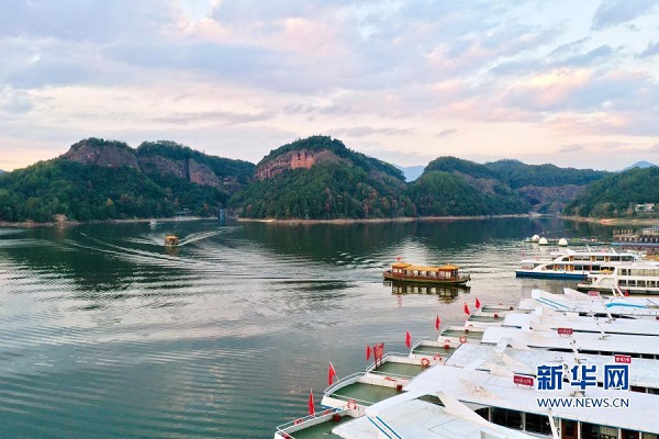 游船駛向福建省泰寧縣大金湖畔的梅口鄉(xiāng)水際村游客碼頭(11月19日攝,無人機(jī)照片)。新華社記者 姜克紅 攝