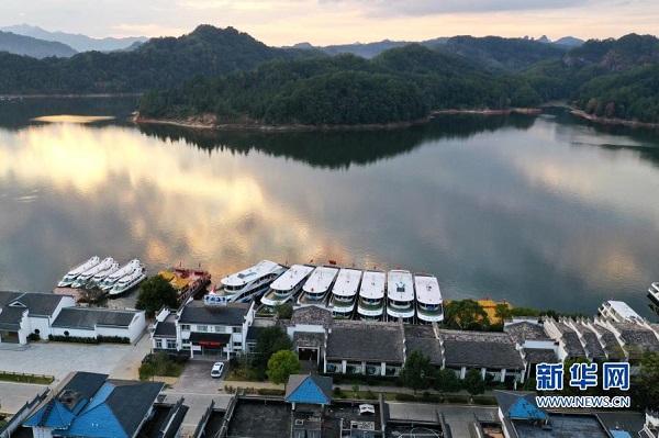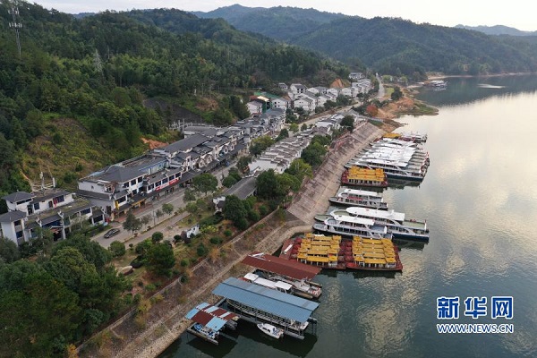 福建省泰寧縣大金湖畔的梅口鄉(xiāng)水際村及游客碼頭(11月19日攝,無人機(jī)照片)。新華社記者 姜克紅 攝