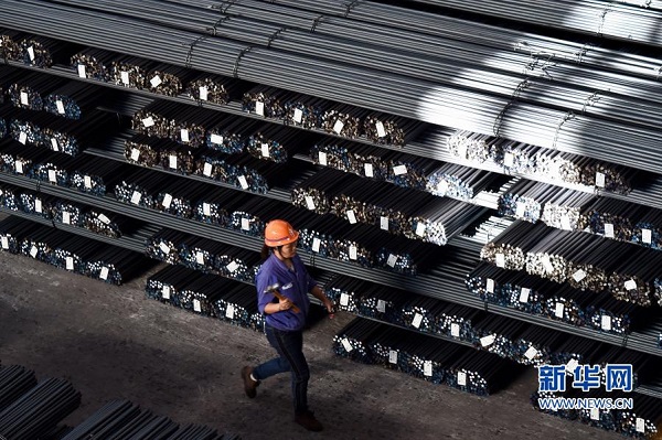 11月17日,福建省三明市三鋼集團的工人走過成品堆放區。新華社記者 姜克紅 攝