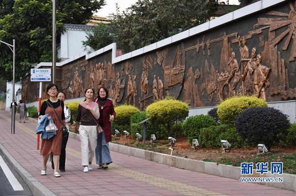 11月17日,行人在福建省三明市三鋼集團生活區走過浮雕墻。新華社記者 姜克紅 攝