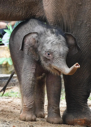 2020年5月27日,廣州長隆野生動物世界的新生亞洲象寶寶在媽媽身邊玩耍。新華社記者 劉大偉 攝