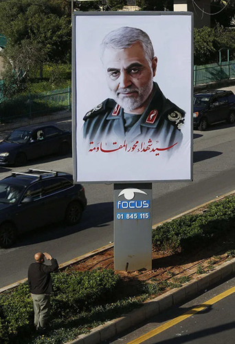2020年1月6日,在黎巴嫩首都貝魯特,一名男子向在美國空襲中被炸身亡的伊朗伊斯蘭革命衛隊將領蘇萊曼尼的肖像敬禮。新華社發(比拉爾·賈維希攝)