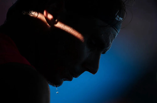 2020年1月25日,西班牙選手納達爾在澳大利亞墨爾本舉行的澳大利亞網球公開賽男子單打第三輪比賽中汗如雨下。新華社記者 白雪飛 攝