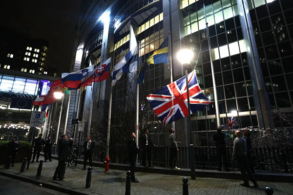 2020年1月31日,在比利時布魯塞爾的歐洲議會外,工作人員降下英國國旗。布魯塞爾當地時間1月31日24時(英國時間1月31日23時),英國正式脫離歐盟。新華社記者 鄭煥松 攝