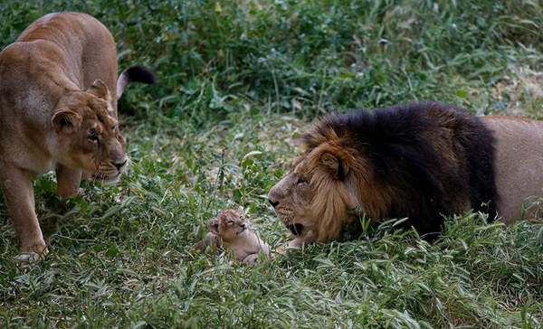 2020年5月7日,在耶路撒冷的動物園內,一只亞洲獅寶寶和父母在一起。新華社發(吉爾·科恩·馬根攝)