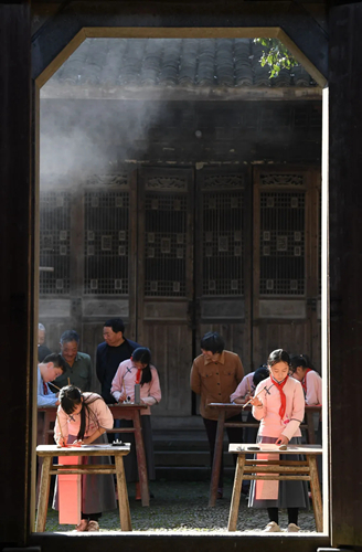 2020年1月7日,新春臨近,浙江諸暨東白湖鎮斯宅村村民在千柱屋一處天井內觀看斯民小學學生寫春聯。新華社記者 翁忻旸 攝