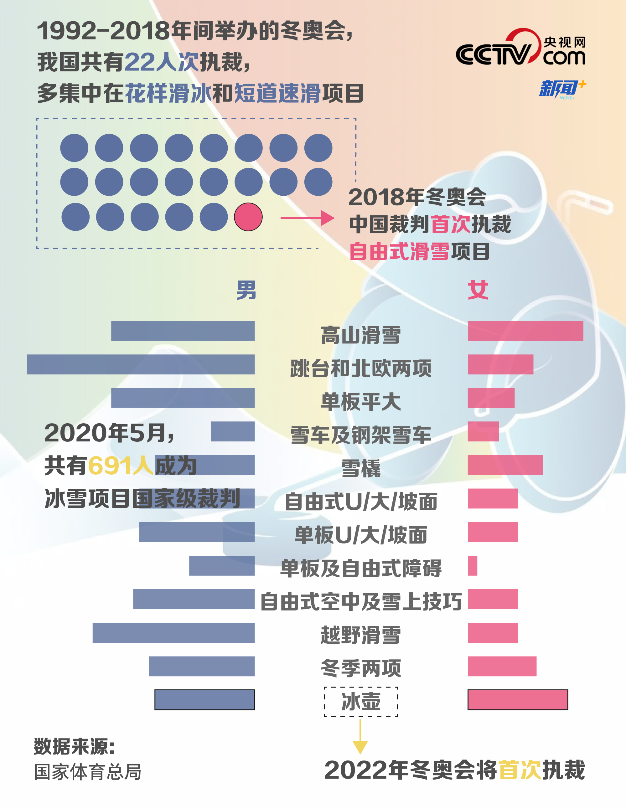 除了選手們在賽場上大放異彩,冬奧會賽場上的裁判席也開始出現“中國身影”。據統計,1992-2018年的冬奧會中,我國共有22人次擔任裁判,2018年的冬奧賽場上出現首位自由式滑雪空中技巧項目的中國裁判。為更好地做好冰雪項目競賽工作,體育總局冬運中心于2020年5月授予691人冰雪項目國家級裁判員稱號,其中多為雪上項目裁判員。值得一提的是,2022年冬奧會將有4名中國冰壺裁判首次執裁rSy安康新聞網