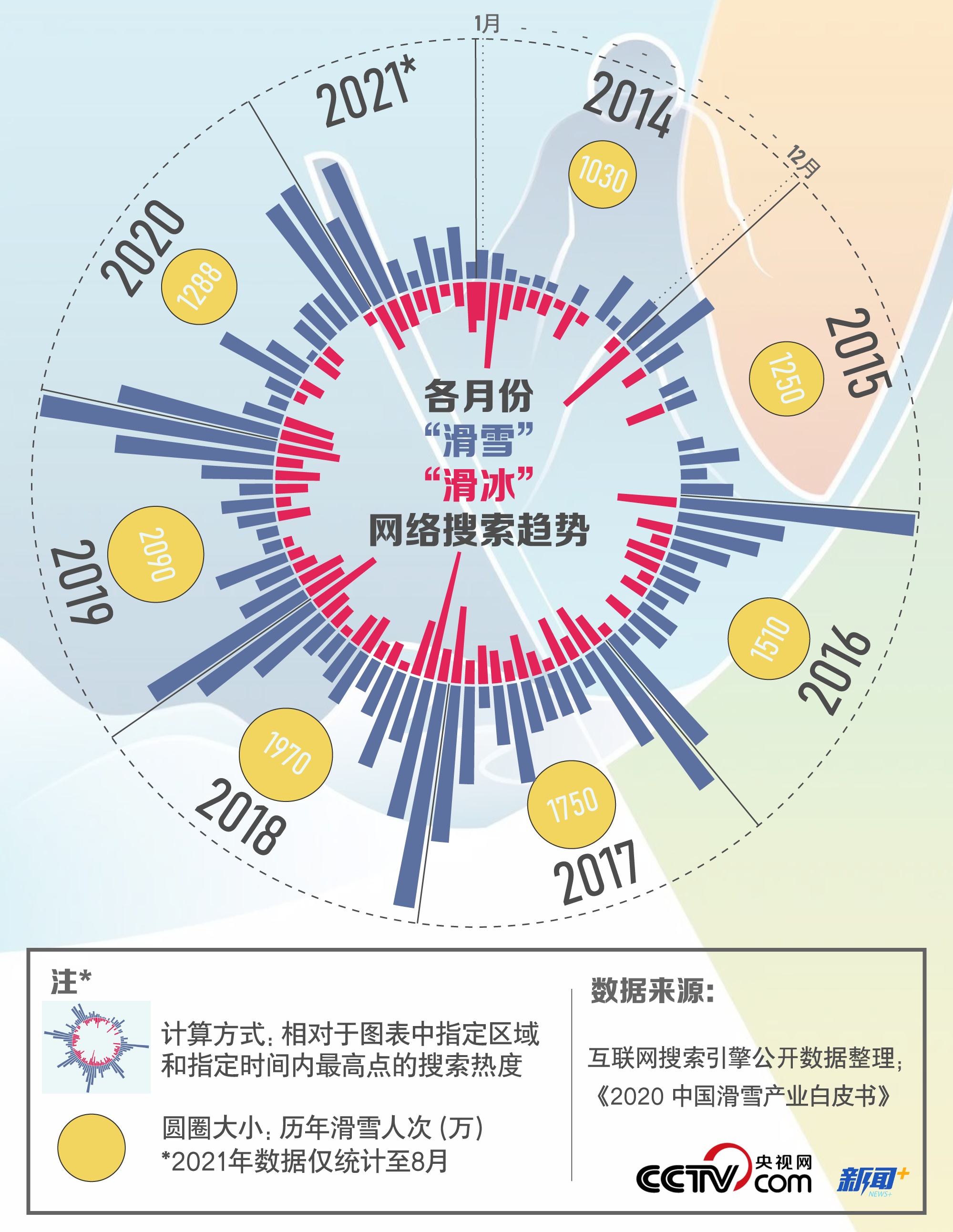 據央視網統計,自2016年起,公眾在互聯網搜索“滑雪”“滑冰”等冰雪項目的頻次明顯上升,且多集中在11月、12月和次年1月。除2020年受疫情防控的影響外,實際參與滑雪項目的群眾也逐年增多,2019年參與滑雪運動的人次是2014年的二倍。rSy安康新聞網