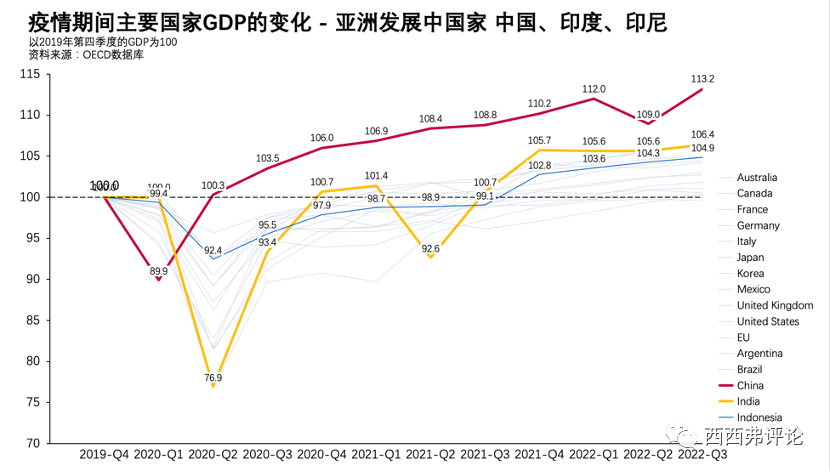 印度作為后起的發展中國家,在疫情前,經濟增速已經超過中國。但疫情這三年,中國擴大了和印度之間的差距。中國2022年三季度,GDP是2019年四季度的113.2%,印度則只是106.4%。