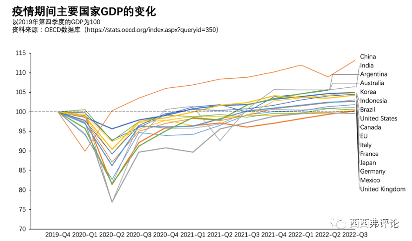 所以,看各國經濟,得以疫情前的數據作為基準。最近OECD數據庫更新了主要國家今年三季度的GDP增長數據,印度的三季度數字也出來了。我根據這個,更新了一下最新的各國GDP,以2019年第四季度的GDP為100。