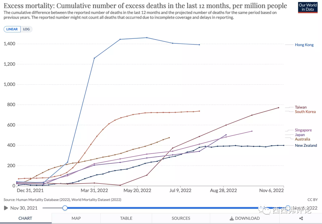 過去十二個月的累計超額死亡率,香港飆升到了萬分之十四,臺灣接近萬分之八,新加坡也超過了萬分之五。目前只有新西蘭,還在萬分之五以下。即使這樣,這幾個國家或地區在整個疫情期間的超額死亡率,仍然遠遠低于大部分歐美國家,他們仍然是抗疫的優等生。