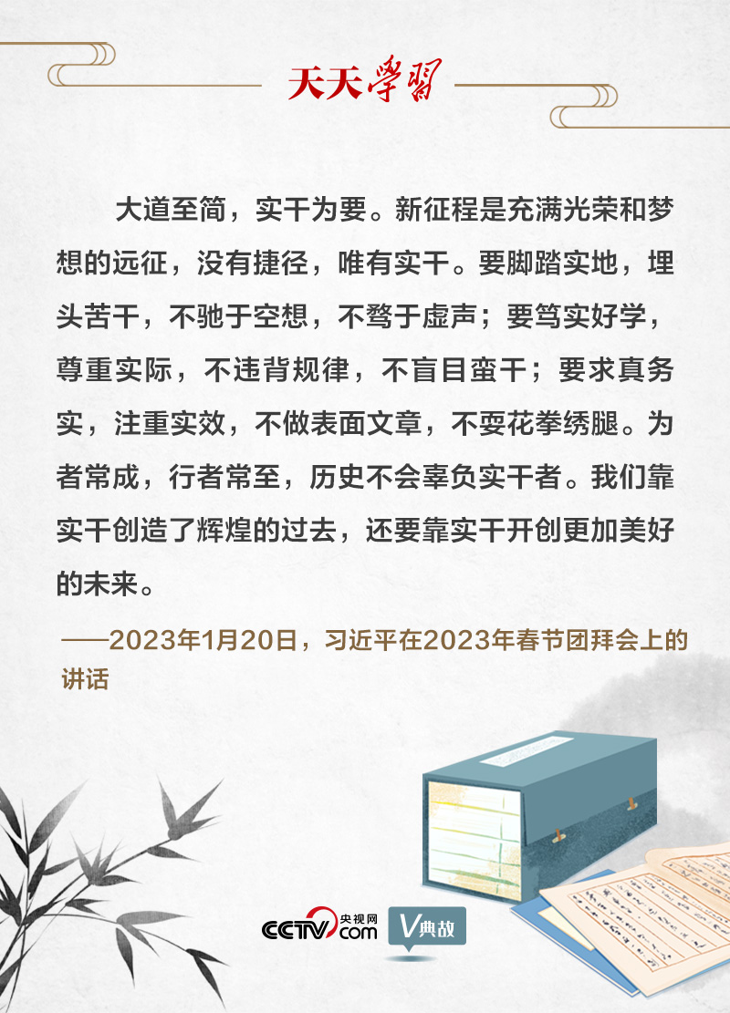 /天天學習/ 1月20日舉行的2023年春節團拜會上,習近平總書記指出,新征程是充滿光榮和夢想的遠征,沒有捷徑,唯有實干。他引用古語“為者常成,行者常至”,發出新春號召:歷史不會辜負實干者。我們靠實干創造了輝煌的過去,還要靠實干開創更加美好的未來。