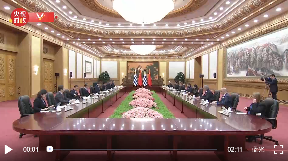 習近平指出,很高興同拉卡列總統先生見面,歡迎你對中國進行國事訪問。2023年是中烏關系史上特殊的一年,既是兩國建交35周年和烏拉圭加入共建“一帶一路”倡議5周年,也是你的父親、中國人民的老朋友拉卡列·埃雷拉前總統訪華30周年?偨y先生這次訪華具有重要意義。