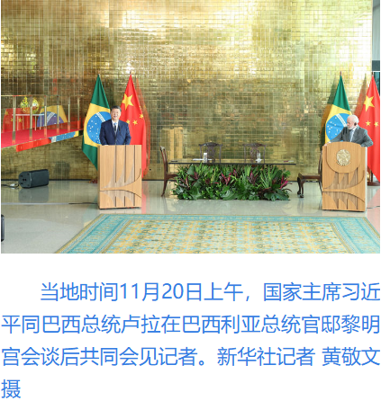 新華社巴西利亞11月20日電(記者楊依軍 周永穗)當(dāng)?shù)貢r間11月20日上午,國家主席習(xí)近平同巴西總統(tǒng)盧拉在巴西利亞總統(tǒng)官邸黎明宮會談后共同會見記者。
