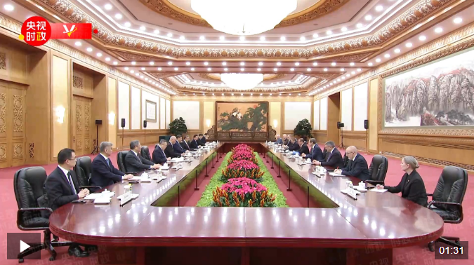 習近平表示,中俄建交75年來,兩國攜手走出了一條大國、鄰國相互尊重、和睦相處、合作共贏的嶄新道路,樹立了新型國際關系和相鄰大國關系的典范。中方愿同俄方加強發展戰略對接,挖掘兩國合作內生動力,不斷造福兩國和兩國人民。中俄要密切在聯合國、金磚合作機制、上海合作組織等多邊框架內的溝通和協作,堅定維護以聯合國為核心的國際體系,踐行真正的多邊主義,推動國際秩序朝著更加公正合理的方向發展,共同維護全球戰略穩定和國際公平正義。
