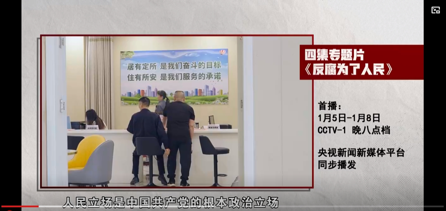 由中央紀(jì)委國(guó)家監(jiān)委宣傳部與中央廣播電視總臺(tái)聯(lián)合攝制的四集電視專(zhuān)題片《反腐 為了人民》,將于1月5日至8日在中央廣播電視總臺(tái)央視綜合頻道晚8點(diǎn)檔播出。