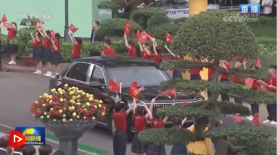 四月的河內,林木蔥郁,生機盎然。主席府廣場上,五星紅旗同金星紅旗迎風飄揚,200多名越南少年兒童揮舞旗幟,熱烈歡迎習近平到訪。