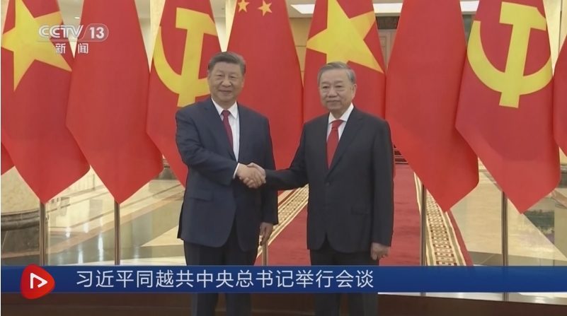 習近平指出,很高興對越南進行國事訪問,實現同蘇林總書記的首輪互訪。今年是越南共產黨成立95周年、越南建國80周年和南方解放50周年,我代表中國共產黨和中國政府向越方致以熱烈祝賀。中方將一如既往支持越南走好符合本國國情的社會主義道路,勝利召開2026年越共十四大,朝著建黨建國“兩個一百年”奮斗目標不斷邁進。