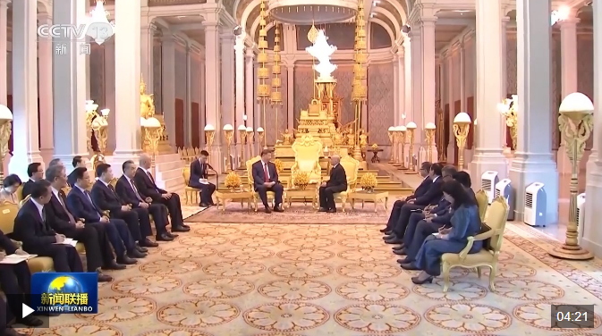 習近平指出,很高興在西哈莫尼國王登基20周年和柬歷新年之際應邀訪問美麗的柬埔寨,謹向柬埔寨人民致以新年祝福。柬埔寨國家建設事業蒸蒸日上,相信在西哈莫尼國王庇佑下,勤勞智慧的柬埔寨人民一定能把國家建設得更加繁榮富強。