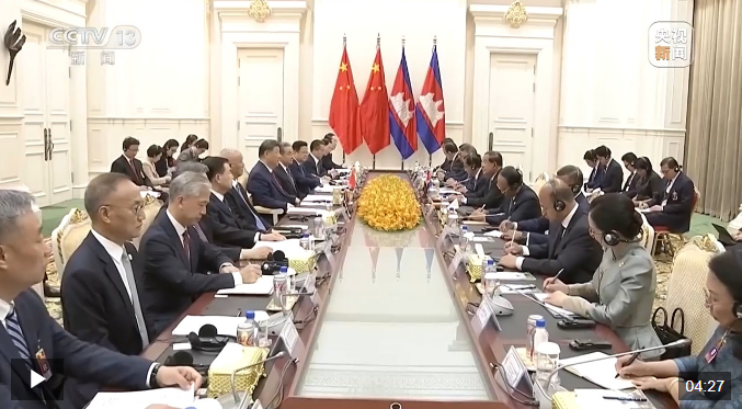習近平指出,中柬兩國是友好鄰邦,更是鐵桿朋友。構建中柬命運共同體是歷史的選擇、人民的選擇。當前,中柬兩國都處在國家發展的關鍵階段,雙方要心系人民福祉,胸懷人類進步,在推進各自現代化進程中,為構建人類命運共同體樹立典范,攜手做世界百年變局中的和平力量、穩定力量、進步力量。