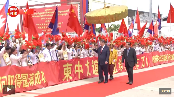 洪森在機場為習(xí)近平主席舉行隆重歡送儀式。習(xí)近平在洪森陪同下檢閱儀仗隊。習(xí)近平向歡送人群揮手致意。