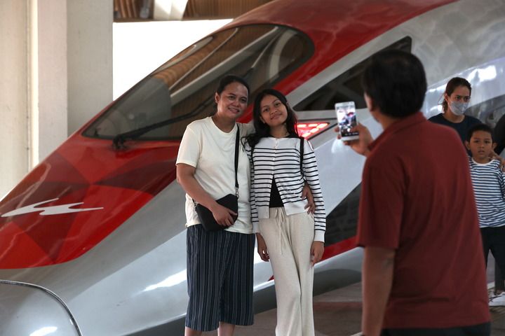 6月19日,在印度尼西亞雅加達(dá)哈利姆站站臺(tái),兩名乘客與雅萬(wàn)高鐵高速動(dòng)車(chē)組列車(chē)合影。 新華社記者 岑云鵬 攝