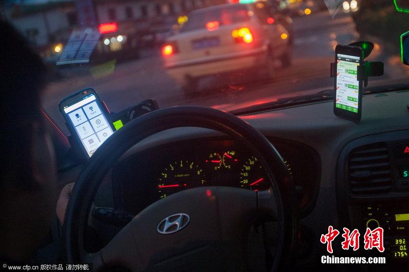 2014年2月19日,杭州,一位出租車司機(jī)同時開著兩款打車軟件。圖片來源:CFP視覺中國