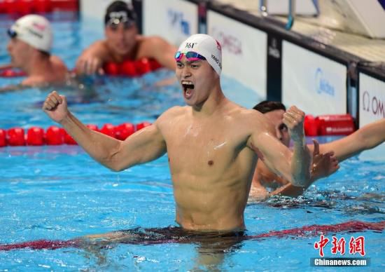 資料圖:當(dāng)?shù)貢r(shí)間8月2日傍晚,第16屆國(guó)際泳聯(lián)世錦賽游泳男子400米自由泳決賽在俄羅斯喀山市舉行,中國(guó)選手孫楊以3分42秒58獲得冠軍。圖為孫楊?yuàn)Z冠后在泳池內(nèi)怒吼……