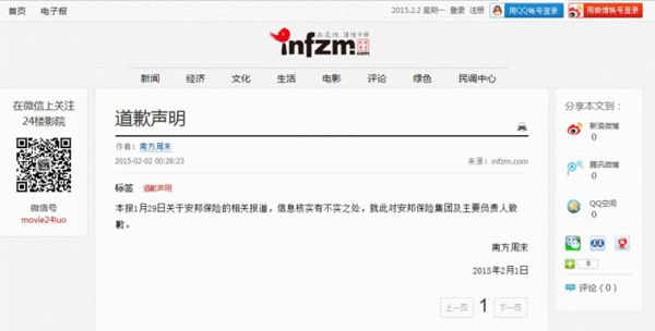 本報1月29日關于安邦保險的相關報道,信息核實有不實之處,就此對安邦保險集團及主要負責人致歉。南方周末2015年2月1日新聞背景:1月29日,南方周末發表題為《安……