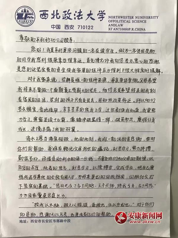 2016年11月24日一個平凡的日子里,一封從西北政法大學經(jīng)濟學院寄來的感謝信,“面對你們的幫助,我唯有銘記父母師長的囑托,刻苦學習,努力拼搏,勤儉節(jié)約,珍惜資助到手的每一分錢,不辜負你們和父母的期望,以自信的態(tài)度,執(zhí)著的信念,刻苦學習,以德博學,完成學業(yè),把自己磨練成品學兼優(yōu)的合格有用人才,為將來更好的回報祖國,回報社會打下堅實的基礎。”她叫王梅,出生于一個貧困家庭的大學生,家住陜西省平利縣洛河鎮(zhèn)線河村一組,父親身患殘疾,母親體弱多病,家庭生活僅靠父母務農(nóng)、打短工維系,家庭月收入不足千元,尚有患精神病的外婆需要贍養(yǎng)。
