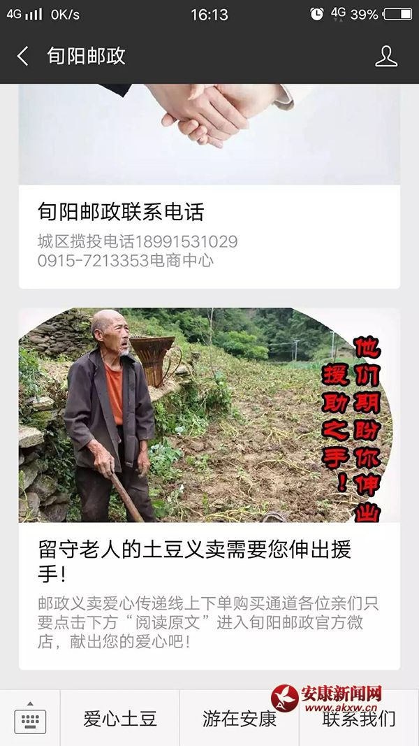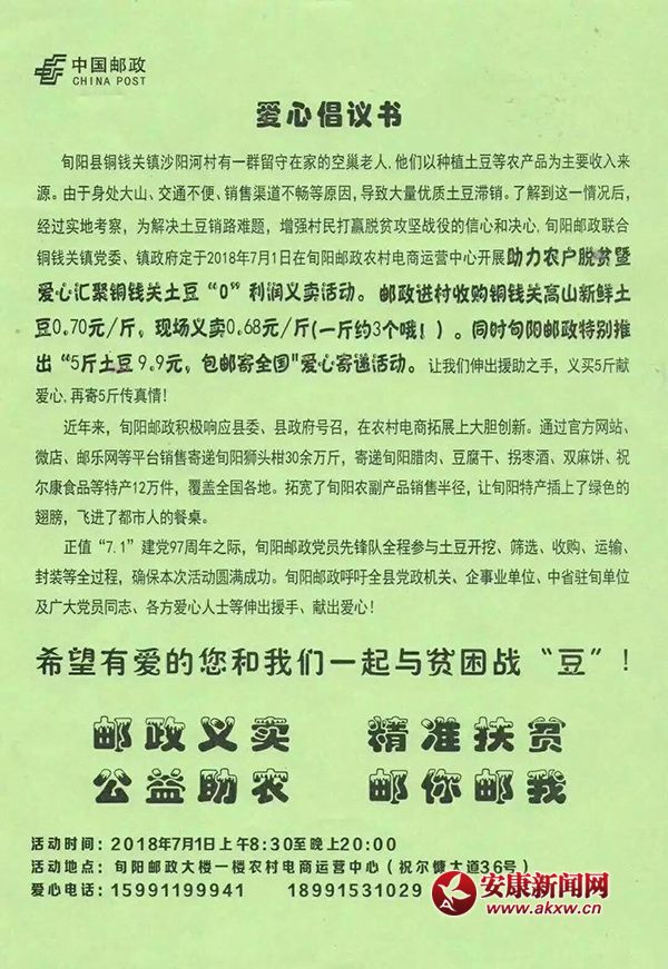 現(xiàn)在,旬陽郵政科學(xué)合理的解決供給矛盾:經(jīng)過實(shí)地考察后,為解決農(nóng)民銷路難題,積極響應(yīng)縣委、縣政府“打贏脫貧攻堅(jiān)戰(zhàn)”的號召,第一時間利用行業(yè)優(yōu)勢,通過“愛心義賣+愛心寄遞+線上訂單”活動的方式將滯銷的土豆銷出去。