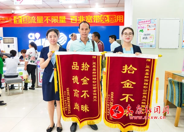 今天,翟先生特意為陳銀及嵐皋營業班送來了錦旗,現場客戶及工作人員對營業員陳銀拾金不昧的高尚情操和品德報以熱烈掌聲。