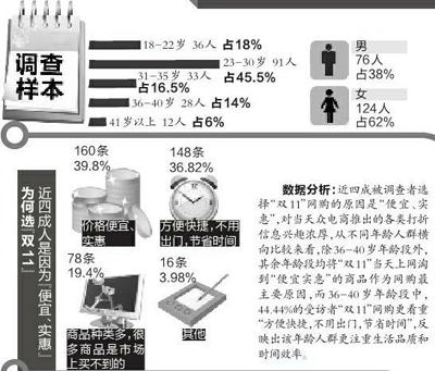 與此同時,在明確表示不參與“雙11”搶購的人群中,33.33%的人擔心商品質量,22.22%的人表示“不想湊熱鬧。”