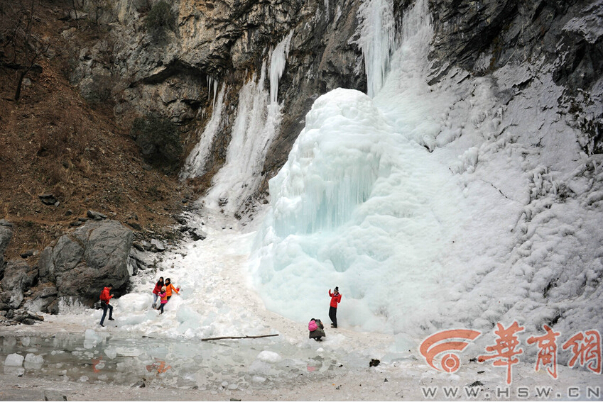 昨日下午2時,游客在戶縣澇峪黑山瀑布前合影留念。不時有冰塊從瀑布上方掉落,著實讓人捏了一把汗 記者 趙彬 攝