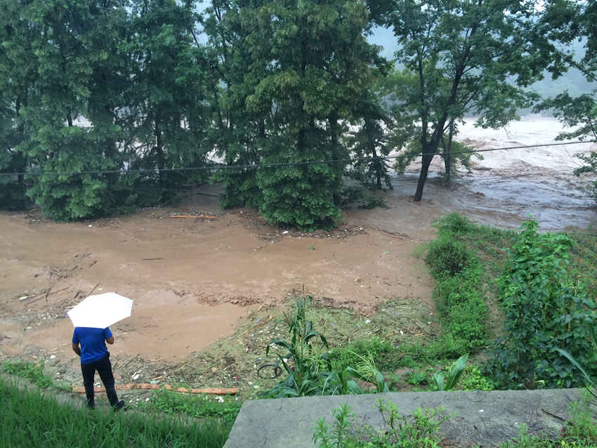昨日下午2時許,南鄭縣牟家壩鎮公路邊一村子,近百米寬的冷水河,水面距離公路不足1米高。一村民正忙著將水邊的木板向家里挪,他說,水面至少已升了三四米,再升就上公路了。