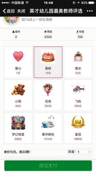 “幼兒園網絡投票評選最美老師,竟然還可以買禮物代替投票,這算不算變相讓家長花錢給老師?”豐禾小區英才幼兒園評選最美老師活動引發爭議,有家長如是說。投票者可送出的禮物從1點愛心到1888點的皇冠不等,其中1點就是1元。