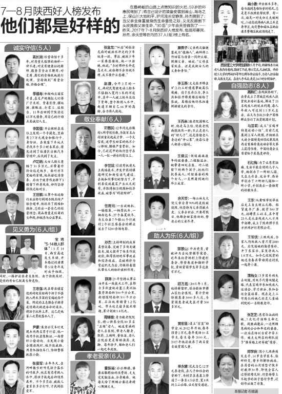 在最崎嶇的山路上點燃知識的火把,59歲的鄧惠民做到了;將自己設計的裝備安裝到高山、海島之上,保山川大地和平,護河流長空靜美,孫杰做到了;當父親全身重度燒傷生命垂危之際,義無反顧割下頭皮挽救父親生命,“90后”少年余天笠做到了……昨天,2017年7-8月陜西好人榜發布,包括鄧惠民、孫杰、余天笠等在內的37人(組)榜上有名。8AD安康新聞網