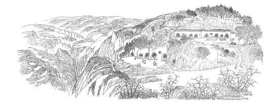 陜北革命舊址寫生,面對復雜的景物,須瞬間分析,即刻做出判斷、選擇、取舍、構圖,抓住整體、突出特點,果斷下筆。以線寫生,務求準確,落筆后,線不可重復,也無法修改。寫生時,常常左手打傘,天熱時遮陽光,每當大汗淋漓,也顧不上擦;下雨時,盡量用傘遮住畫紙,堅持畫完,即便衣服濕透也無所謂。如果對寫生作品不滿意時,就重新赴舊址寫生,僅涇陽縣云陽革命舊址,他就去過4次,清澗縣石嘴驛去了3次,直到畫好為止。