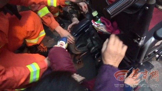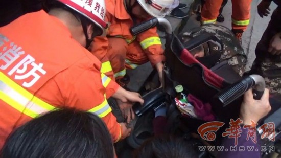 由于這輛輪椅是電動輪椅,小孩的腳就夾在輪椅的擋泥板和輪胎中間,要把小孩的腳取出來就得啟動電源,這樣更容易給小孩造成更大的傷害,消防人員只能一邊安撫小孩的情緒,一邊想辦法利用工具拆卸電動輪椅,將擋泥板和輪子分離開來。