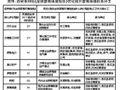 按照《西安市對標〈全球營商環境報告〉優化提升營商環境任務分工》(見附件),各牽頭部門根據各自職責,從世界銀行《全球營商環境報告》中開辦企業、辦理施工許可、獲得電力、登記財產、獲得信貸、納稅、跨境貿易7個核心評價指標入手,圍繞減環節、優流程、壓時限、提效率,牽頭制訂具體工作方案,于2017年10月31日前報市行革辦研究審定后組織實施。市統計局會同市行政學院盡快研究制訂我市縣域營商環境監測評價指標,強化綜合衡量和定期排名,努力提升全市縣域營商環境和市場競爭力。