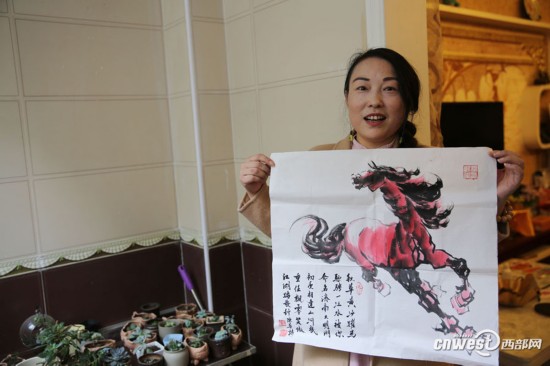 安康鎮坪縣縣城,夾在大巴山里的小城,打開窗戶就能聽到南江河嘩嘩的流水聲,生活在這里的王秀梅說是家鄉的山山水水觸動了她的詩情,寫詩也成了王秀梅最好的休閑方式。王秀梅的筆名叫胭脂小馬,這幅胭脂紅小馬是王秀梅的最愛。她說:“淡泊識詩味,寂寞著文章,我還會在白云上種地,我還會騎上我的胭脂小馬,馳騁在化龍山,縱情在南江河,還會尋找生命的根。”Dkf安康新聞網