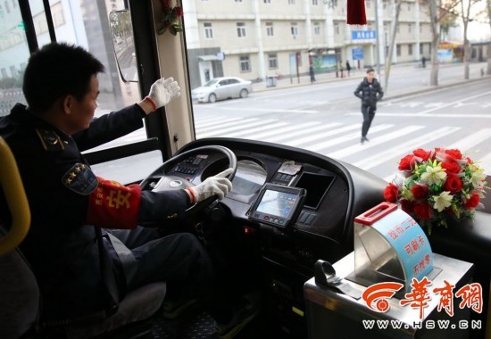 800路公交車司機趙紅權師傅在在斑馬線前停車讓行人,并揮手示意讓行人放心通行。 華商報記者 鄧小衛 攝