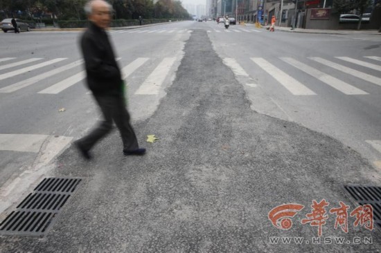 29日上午,華商報記者趕到建工路,王先生所說的西行車道馬路路面中間車道顯然是新修過的,但表面卻似乎蓋著一層碎渣類的東西,圍著深色路面擺放著幾個活動隔離墩,一名環衛工裝束的老漢正在新科路路口路段清掃路面的碎渣,旁邊一輛小推車上已經裝了大半車碎石子。