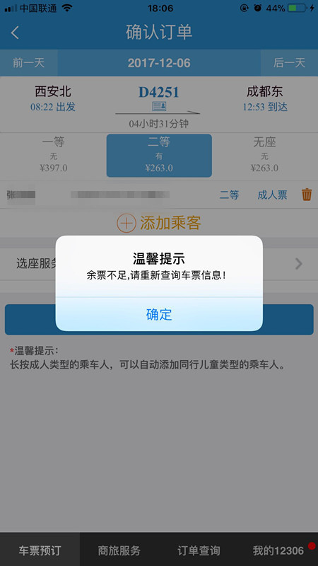 此外,12月6日承擔西成高鐵成都東開往西安北方向首發任務的D4252次旅客列車車票同樣也全部售罄。截至記者發稿時,往返西安北至漢中、重慶方向的動車組列車余票充足,旅客可順利購買。