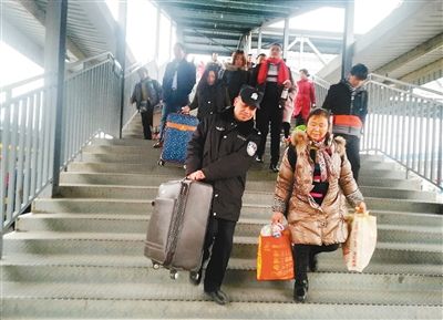 民警幫助旅客拎包,將其送至站臺。記者張松 通訊員楊長空 郝黎俊 攝