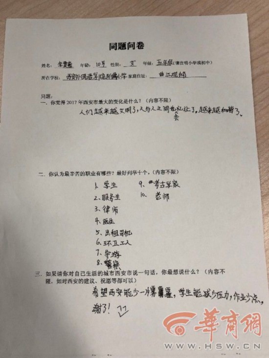 11歲的王慧倩在碑林區建國路小學上學,她寫下環衛工人、醫生,為啥呢?“環衛工人每天起得很早,回得很晚,地上有垃圾他們就得收拾!彼f,醫生每天都要給病人看病,“很晚的時候,大家都睡覺了,要去找醫生,醫生不睡覺要給病人治病!