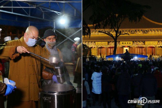 1月24日,臘八節,西安市大興善寺三個食堂10口大鍋通宵熬臘八粥,有市民凌晨3點多就去排隊,到6時20分寺廟開始施粥時,大雄寶殿前已有近千人排隊領免費臘八粥。